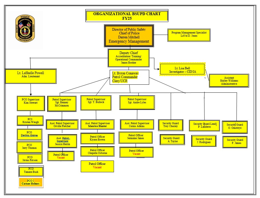 Campus Safety Organizational ChartSubmenuPolice & Public SafetyBusiness Continuity PlanClery ActCrime LogsCrime ReportingProtecting Our CommunityMarijuana Prohibition on CampusEmergency PreparednessOfficial PoliciesParking and TransportationPrograms and InitiativesOrganizational ChartSexual AssaultStaff DirectoryHome›About›Administration & Governance›Administration & Finance›Police & Public Safety›Campus Safety Organizational Chart View the Campus Safety Org Chart (pdf)