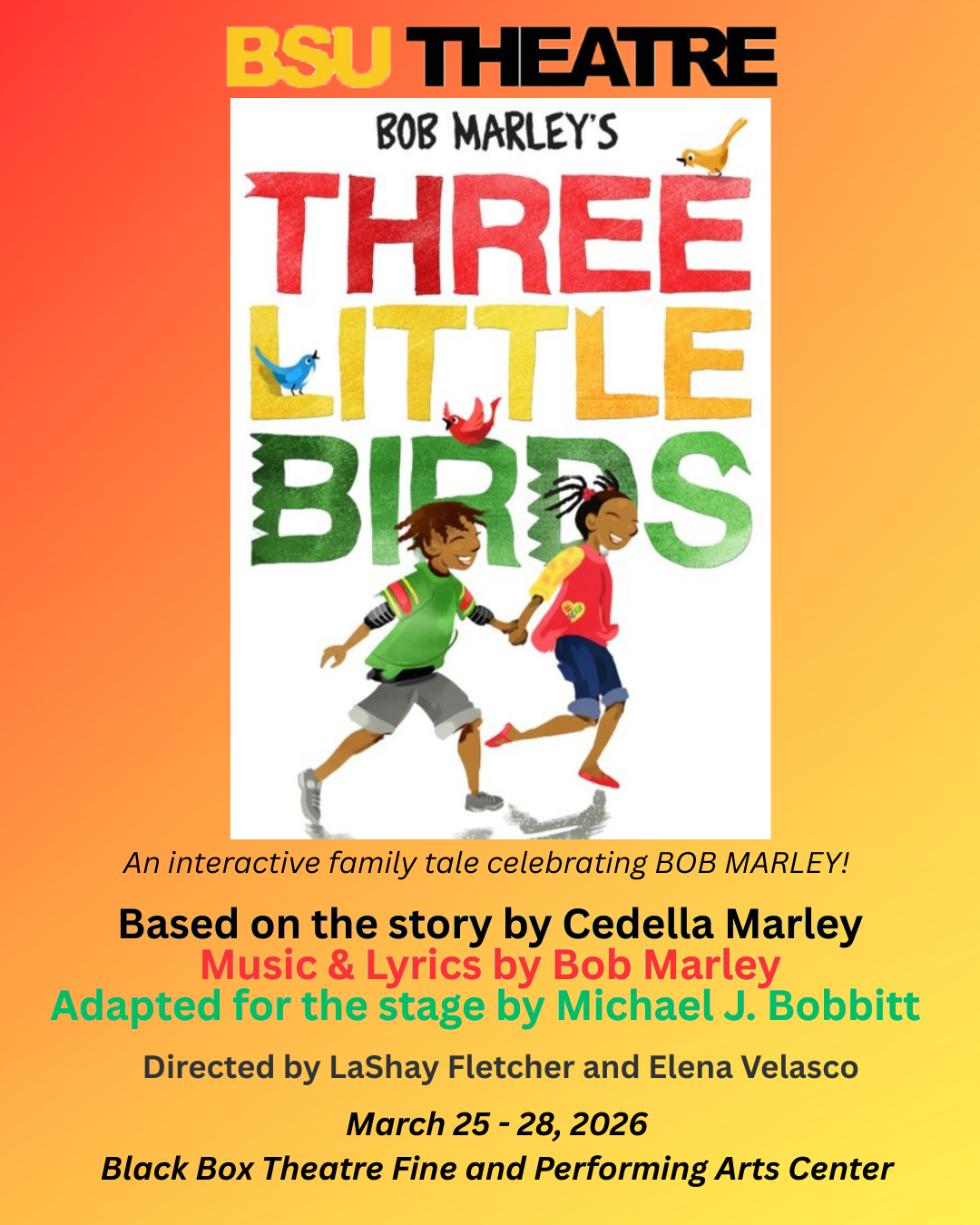 BOB MARLEY’S THREE LITTLE BIRDS, adapted for the stage by Michael J. Bobbitt with music by Bob Marley, is based on the story by his daughter, Cedella Marley. This musical for young audiences, co-directed by BSU Theatre junior LaShay Fletcher and Elena Velasco, is an immersive family theatre event that shares the message of love of self, family, and culture, inviting peace for a new generation of songbirds.