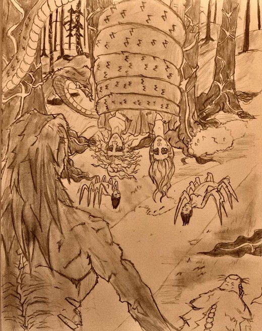 We hear a crack and realize our feet just broke a twig. Crap. Something wraps around our bodies, pinning us together until only our heads are uncovered. At the end of what is holding us is the head of a snake with no eyes. We are yanked off the ground, flying up, screaming. We both close our eyes as we feel the snake pulling us down. It stops just as we are about to hit the ground. We open our eyes to see we are hanging upside down in front of the mutant leader's face. I look at the long body of the snake to see it’s attached to the end of the three headed moose. The scaly tail I saw earlier was this. A long snake with no eyes. The three-headed moose creature is keeping its snake tail wrapped around us tightly. And holding us in front of the leader of these mutant creatures.