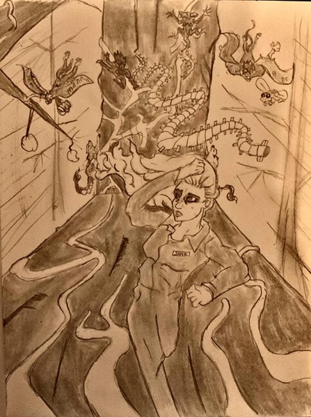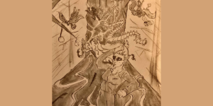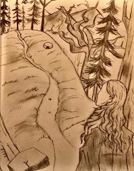 There it is again, the monstrous voice I heard before. My eyes are drawn to where it’s coming from as I keep walking forward with my head down. On top of the three-headed moose is a human figure—a man. His wild hair is long, coming down to his upper back. He looks like he’s wearing fur. No, not wearing it, covered in it like he grew it himself. I can tell he’s probably muscular underneath all of it. He snarls in frustration. This is the voice I heard. I look in front of me and see John crouched down on the ground behind a log, looking at the herd. Twigs in his afro and mud on his face.