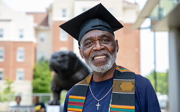 Cleveland Ray- Artis is graduating with a degree in psychology at the age of 79. Cleveland, diagnosed with PTSD in 2014, decided he wanted to study psychology and use his education to help troubled youths and veterans who share his condition. He started at Prince George’s Community College before transferring to Bowie State in 2020. Even though it had been 50 years since Artis last stepped foot on a university campus, he says he felt right at home at Bowie State.
