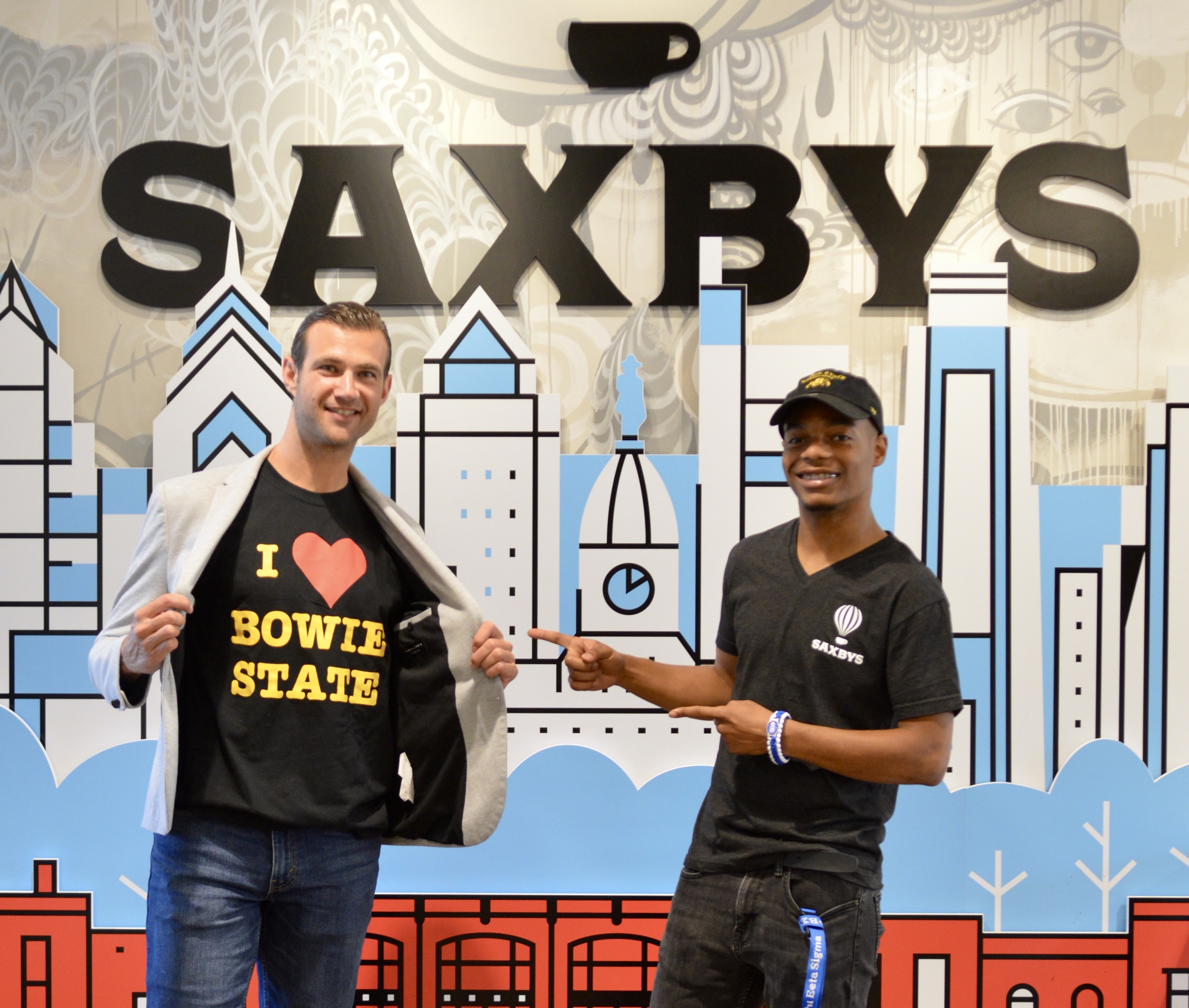 Saxbys CEO Nick Bayer (left) celebrates the partnership with Bowie State with the inaugural student CEO Devin Gallion (right) for the Saxbys at Bowie State.